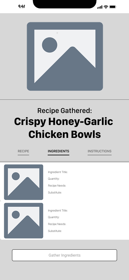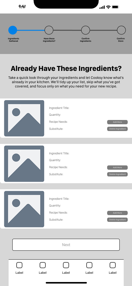 Mid-fidelity wireframes used to explore hierarchy and primary actions during ingredient review.