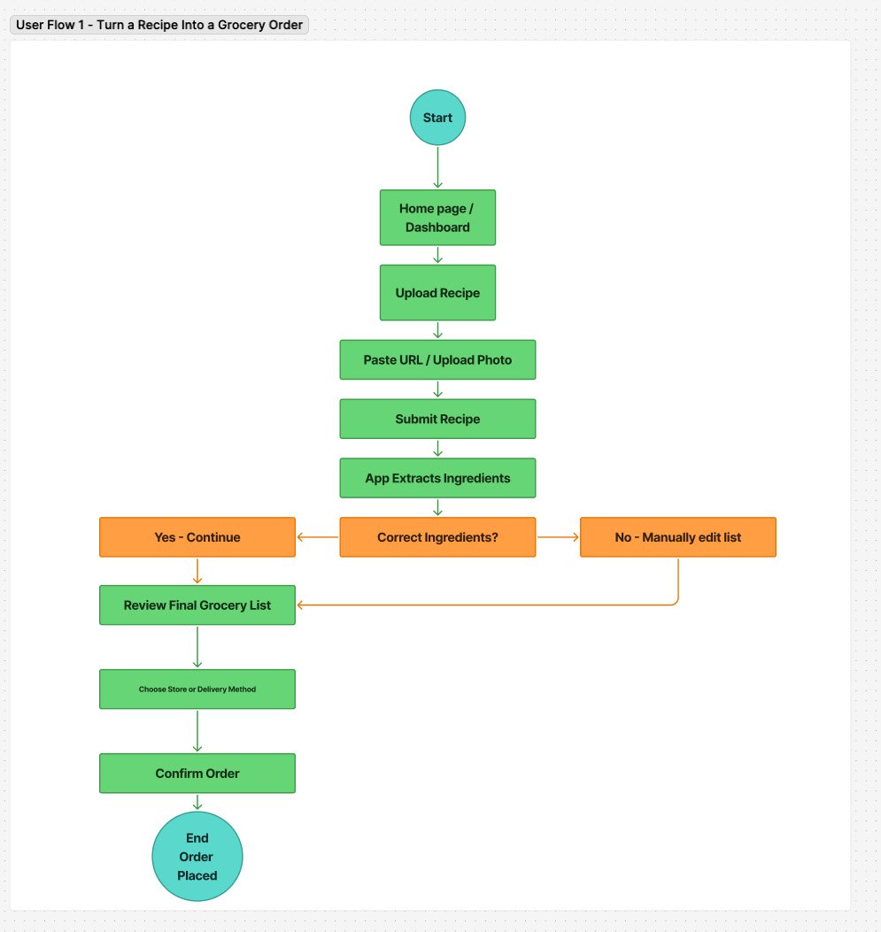 Design Focus: Create a clear, low friction path that helps users move from saving a recipe to a grocery ready ingredient list.
