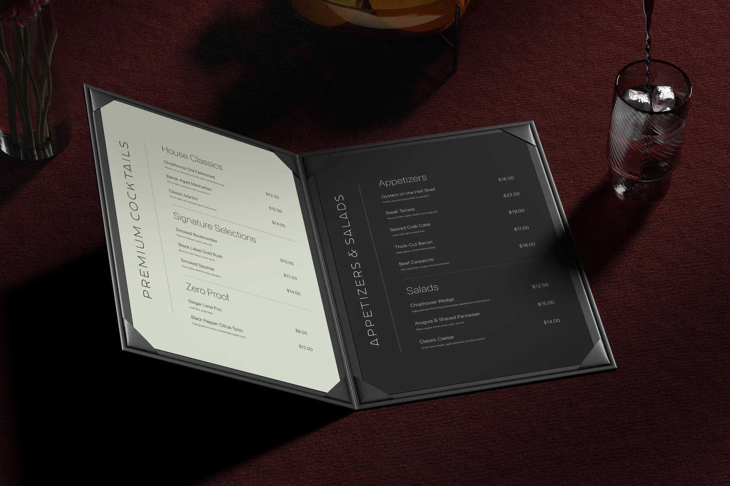 A premium steakhouse branding concept focused on identity, menus, environmental signage, and digital touchpoints.