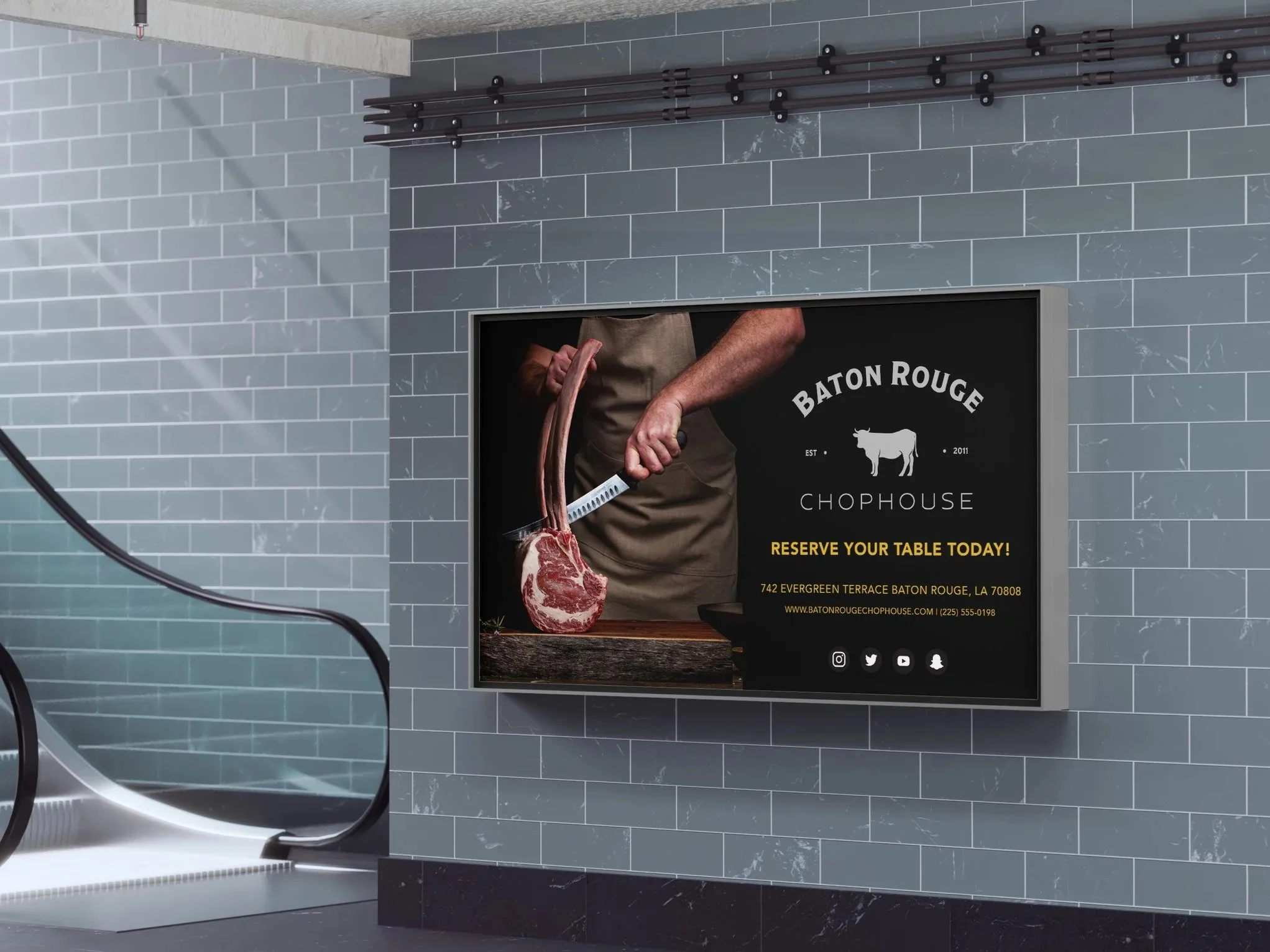 These applications demonstrate how the Baton Rouge Chophouse identity extends beyond the logo into practical, guest-facing experiences. From printed menus and small-scale details to environmental signage and a streamlined reservation flow, each touchpoint reinforces the brand’s refined, confident tone while remaining clear and functional in real-world use.